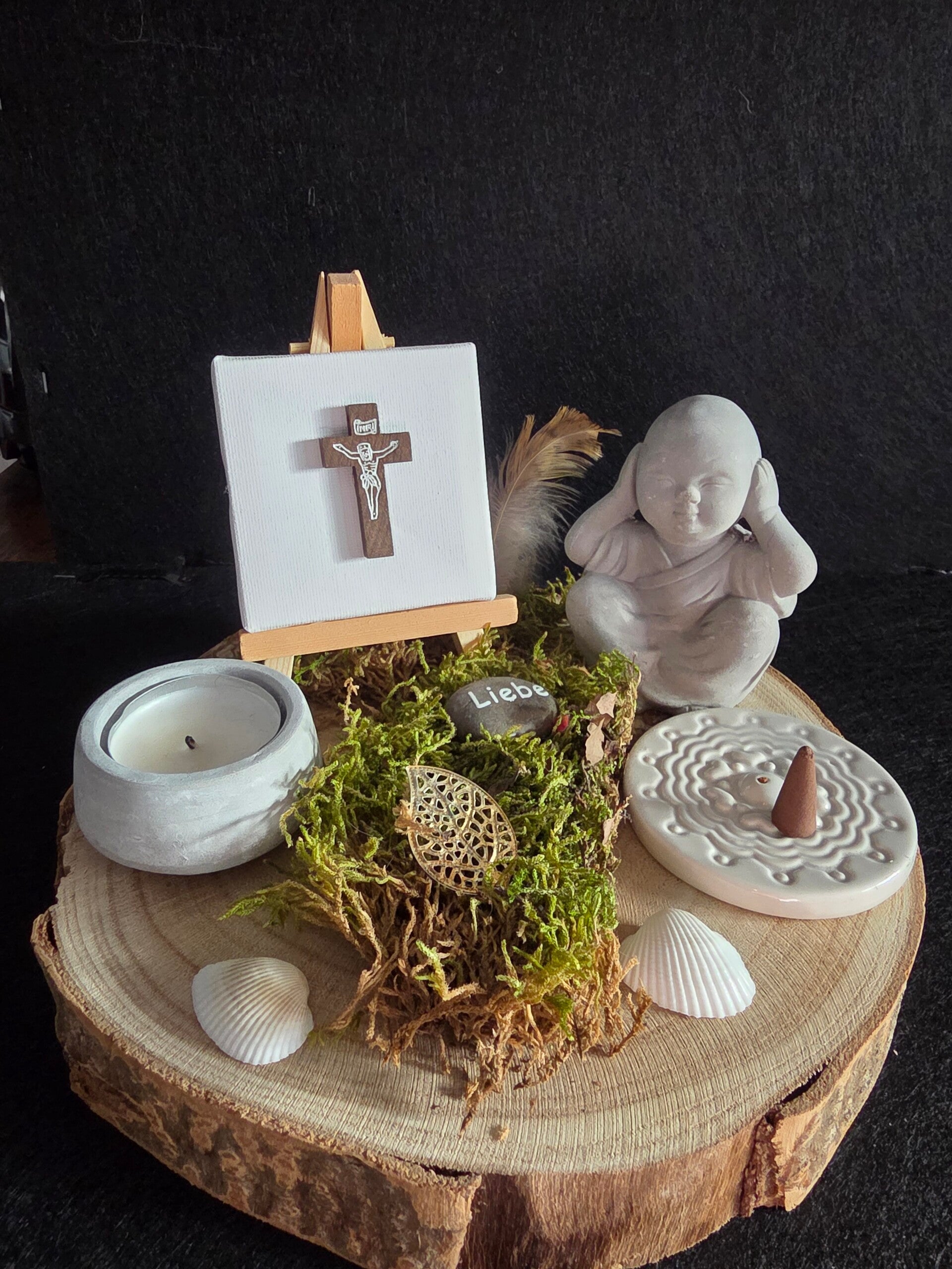 Ein kleiner Ort der Stille mit Kerze, Räucherplatz, Kreuz, Figur (auf Wunsch auch mit Engel, anstatt einem Buddha) und Naturmaterialien auf einer Holzscheibe. Liebevoll zusammengestellt als stiller Begleiter im Alltag.