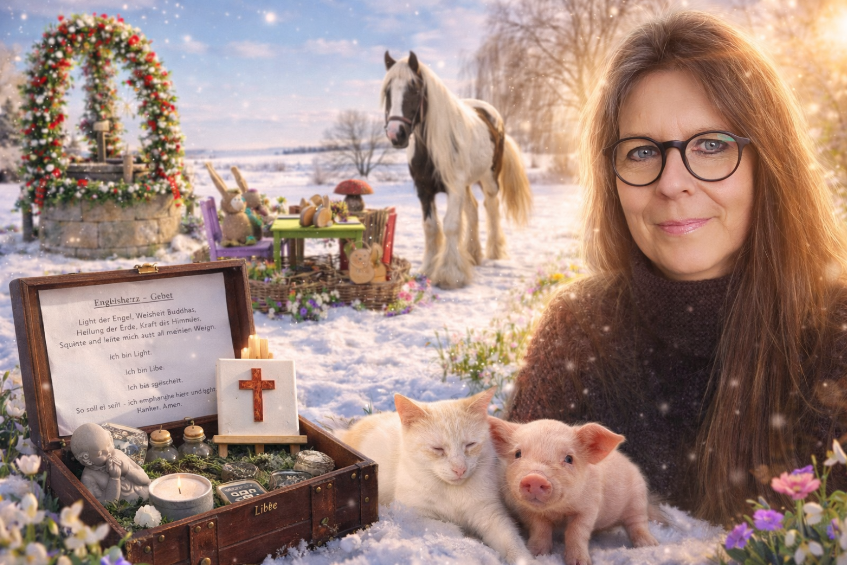 Dann erschien ein Traum, der sich wie ein Geschenk anfühlte. Eine winterliche Landschaft lag ruhig da, und der Schnee glitzerte im Licht, als würde sich etwas Helles darin widerspiegeln. Die Frau trat hinaus und betrachtete dieses Bild, während sie nach anderen rief, doch niemand kam mit ihr hinaus. So blieb sie allein in diesem Moment, nicht einsam, sondern still, und nahm wahr, was da war. Mit der Zeit begann der Schnee zu schmelzen, der Regen setzte ein und das Glitzern verschwand, doch gleichzeitig entstand ein leises Verstehen, dass das, was einmal gesehen wurde, im Inneren weiterlebt, auch wenn es im Außen vergeht.